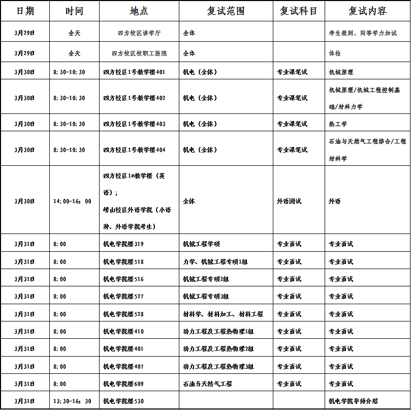 说明: 3月29日报到时,请在报到处--pg娱乐电子游戏举牌位置填写报到登记详情表;3月30日专业课考试科目《机械原理》的考生请自带绘图工具;3月31日专业面试分组名单详见当天pg娱乐电子游戏楼一楼张贴,各复试专业按照公布名单的顺序依次进行,政审表在面试时请交于各组政审老师;529房间为考生面试候场处。