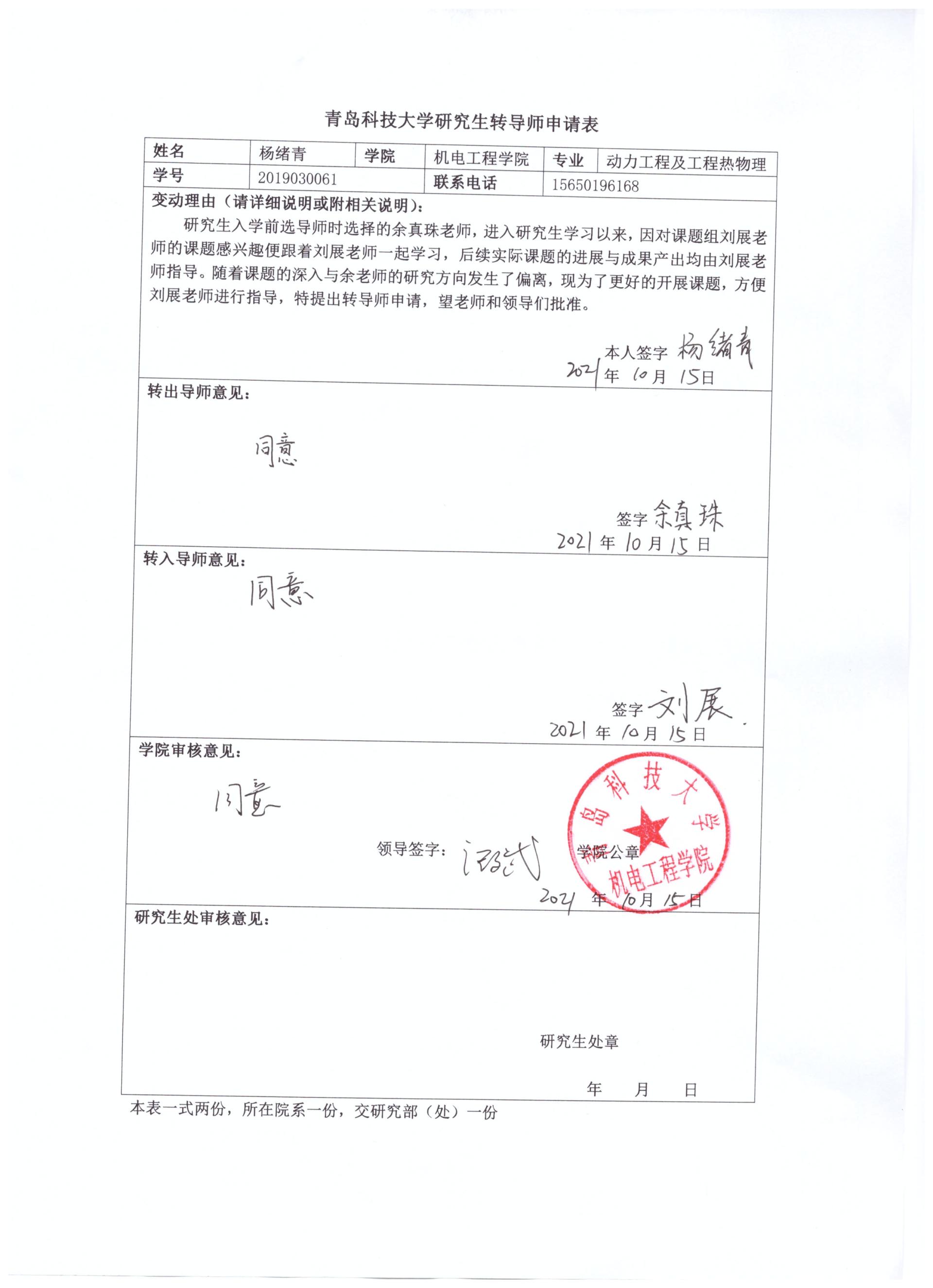 pg娱乐电子游戏研究生转导师申请(杨绪青)