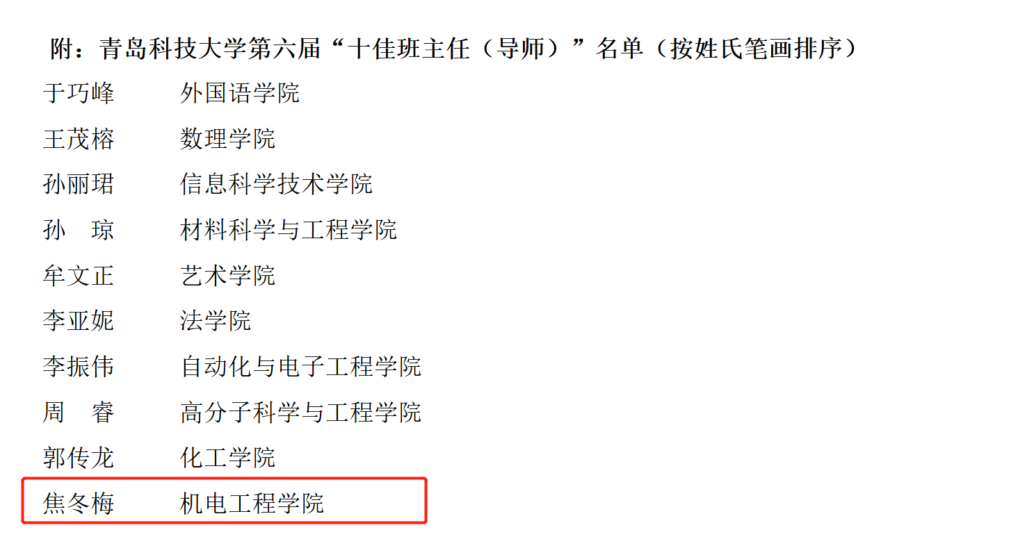 据悉,根据《pg娱乐电子游戏十佳班主任(导师)评选办法》(青科大学字﹝2014﹞30号),学校组织开展了第六届“十佳班主任(导师)”评选。经过学院(校区)推荐、学校审核、学生评议、网络投票和评审委员会投票等环节,拟确定焦冬梅等10名班主任(导师)为pg娱乐电子游戏第六届“十佳班主任(导师)”。