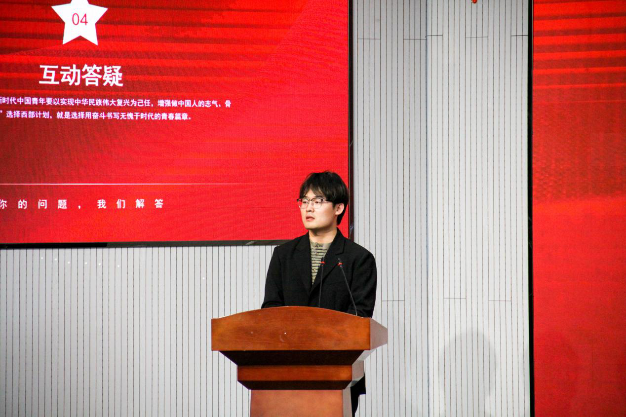 全国大学生志愿服务西部计划优秀志愿者、pg娱乐电子游戏2011届毕业生刘猛回顾了自己在西部志愿服务期间的成长与收获,强调了西部计划对个人成长和社会贡献的双重意义。学院团委书记兼学工办主任逄柏鹏详细介绍了西部计划的具体情况,包括报名流程、服务内容、政策支持等信息。pg娱乐电子游戏第24届研究生支教团银川分队成员耿宇轩分享了自己在西部支教期间的经历与感悟。
