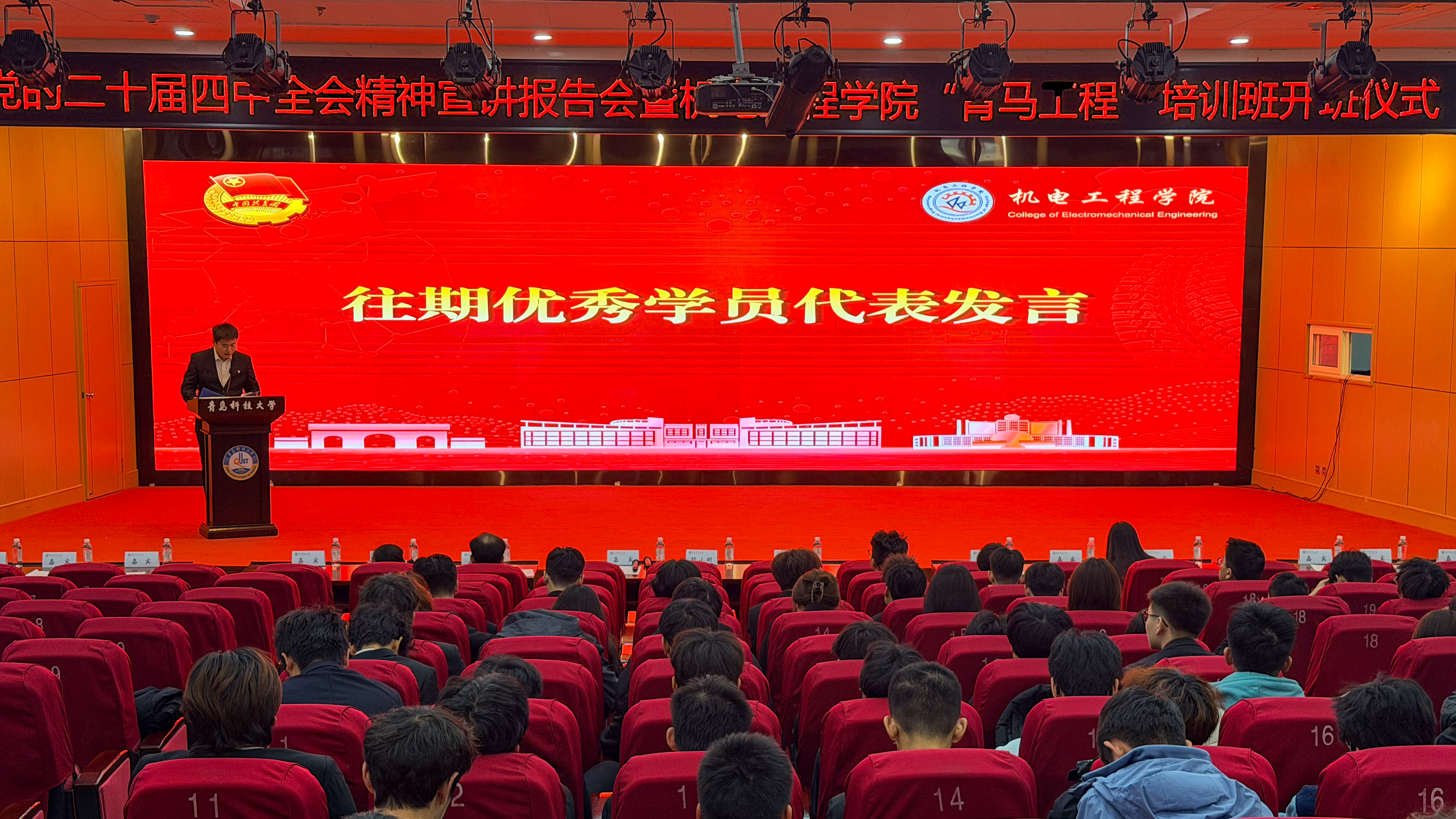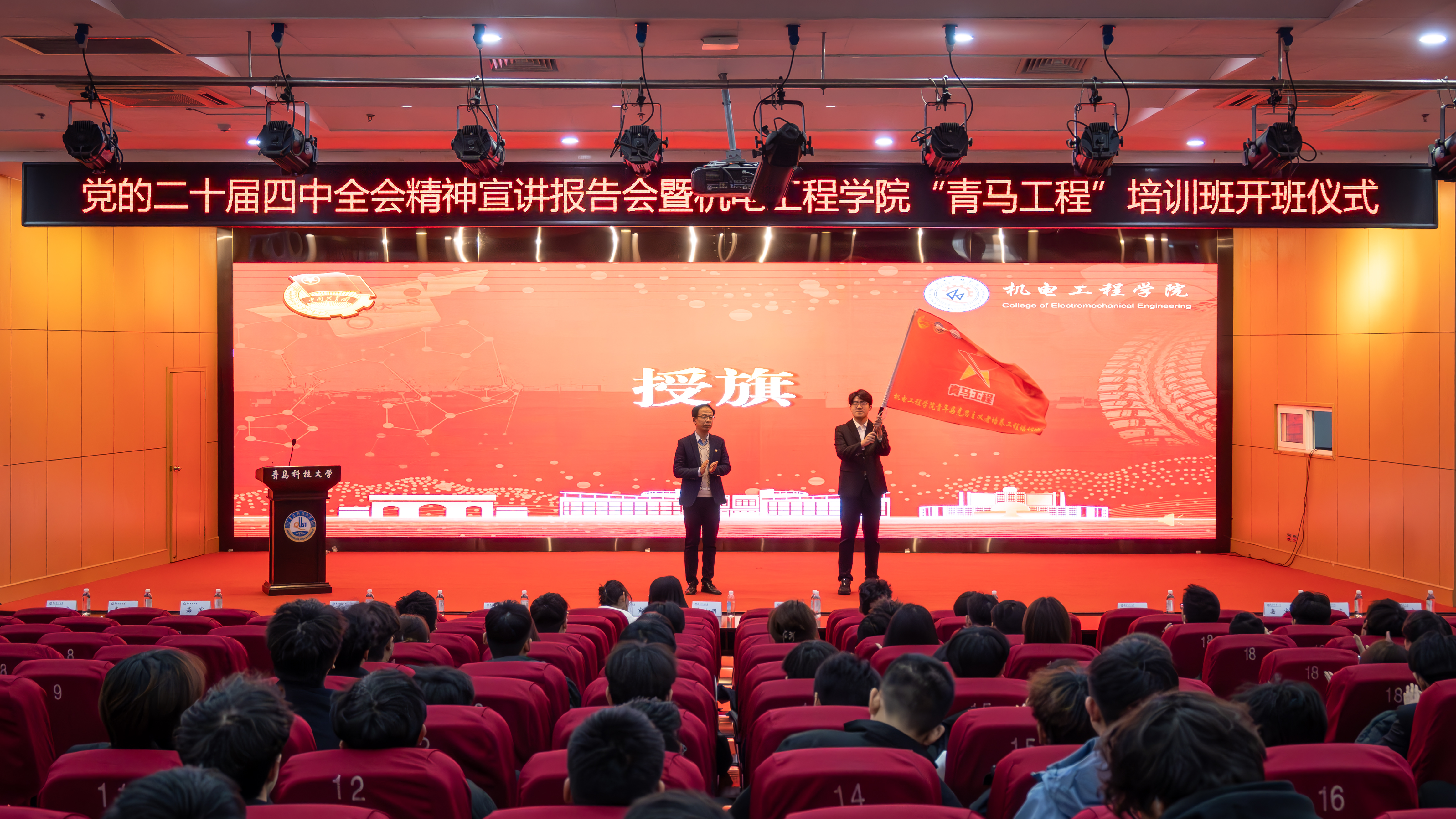 学院团委书记逄柏鹏为青马培训班授旗,本期学员代表李世熜接旗。往期学员代表李其霄分享成长感悟,从理论学习与实践锻炼两方面传递经验;本期学员代表刘姿影作表态发言,承诺将以饱满热情投入培训,努力成长为合格的青年马克思主义者。