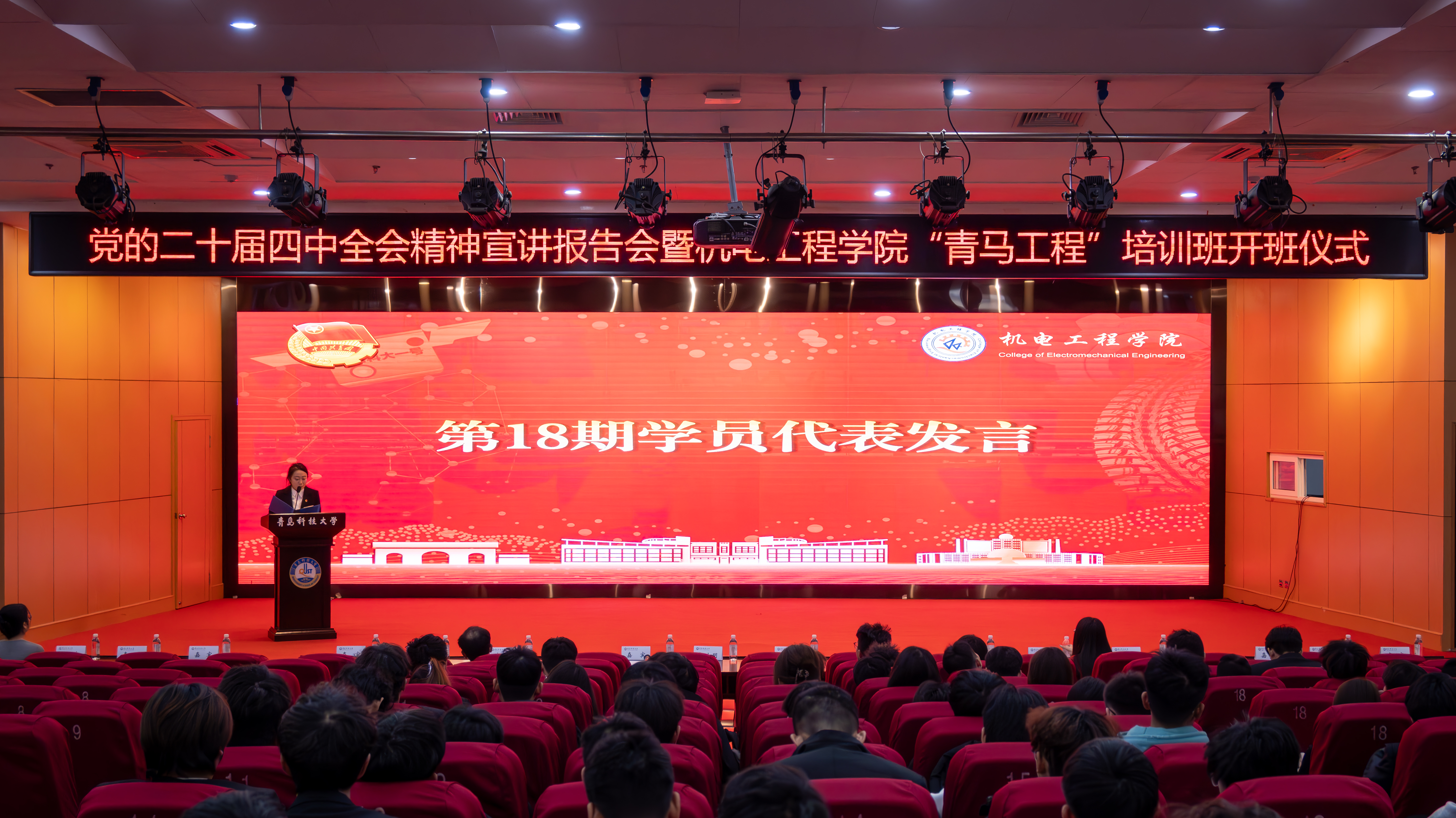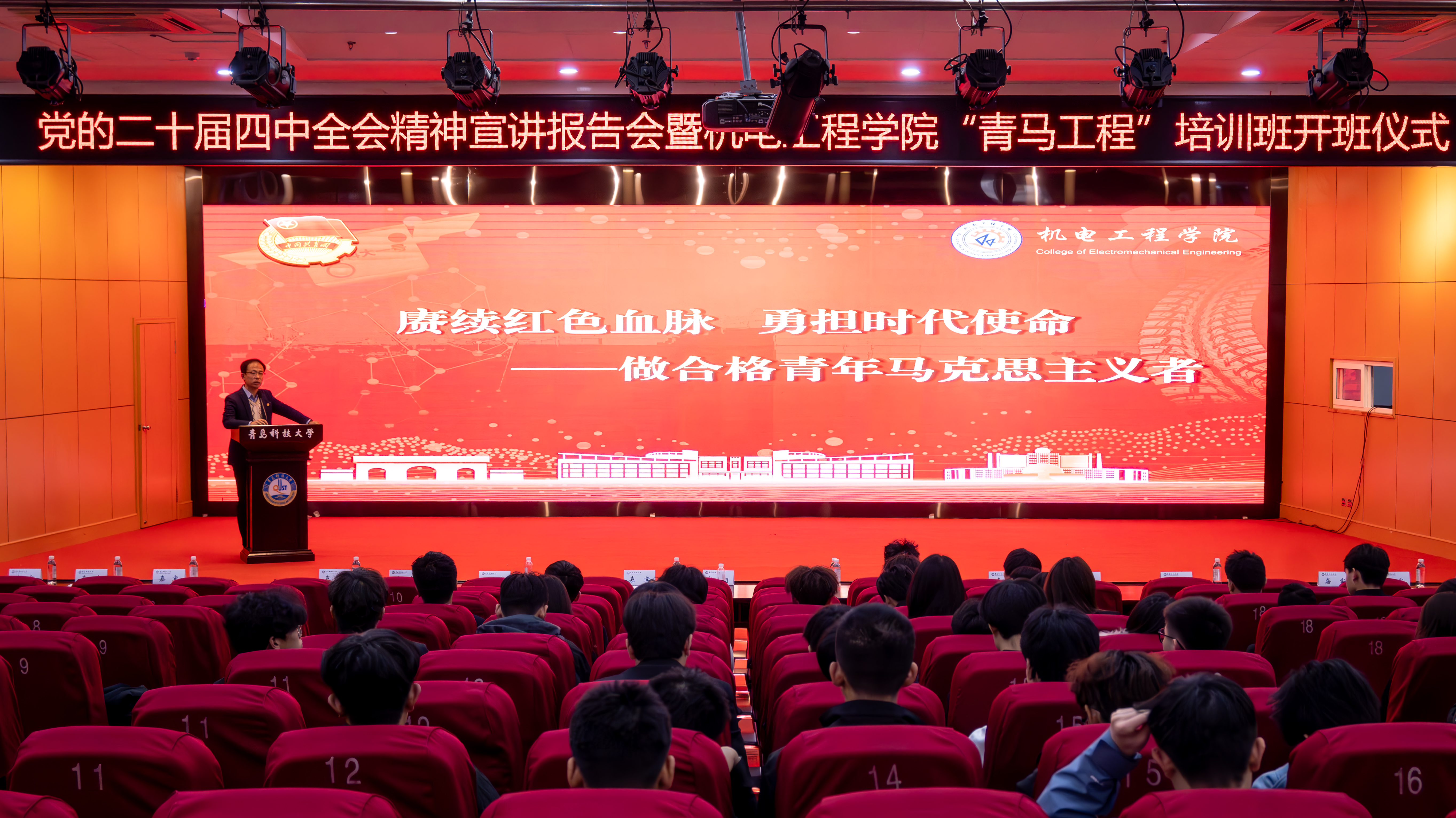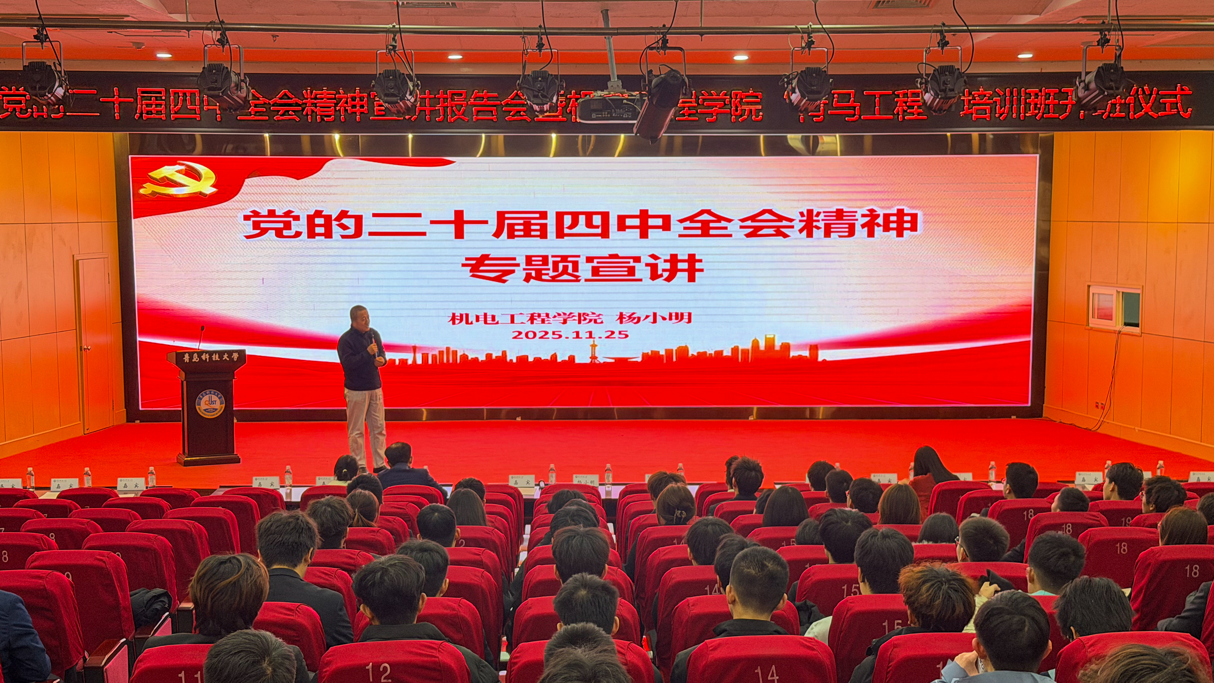 为深入学习贯彻党的二十届四中全会精神,扎实推进青年马克思主义者培养工作,pg娱乐电子游戏于11月25日举办党的二十届四中全会精神宣讲报告会暨2025-2026学年“青马工程”培训班开班仪式。pg娱乐电子游戏党委副书记兼副院长杨小明以及学院全体专兼职团干部,青马工程培训班学员、团校学员代表参与本次会议。开班仪式由学院团委副书记李慧敏主持。