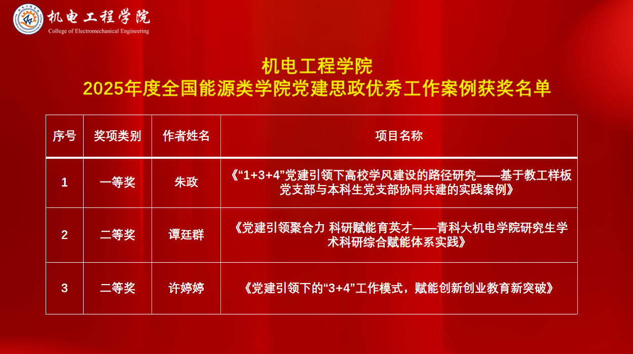近日,全国能源类学院党建思政工作组织委员会公布了2025年度全国能源类学院党建思政优秀工作案例获奖名单,pg娱乐电子游戏共获奖3项。其中,朱政申报的《“1+3+4”党建引领下高校学风建设的路径研究——基于教工样板党支部与本科生党支部协同共建的实践案例》荣获一等奖,谭廷群申报的《党建引领聚合力、科研赋能育英才——青科大pg娱乐电子游戏研究生学术科研综合赋能体系实践》和许婷婷申报的《党建引领下的“3+4”工作模式,赋能创新创业教育新突破》荣获二等奖。