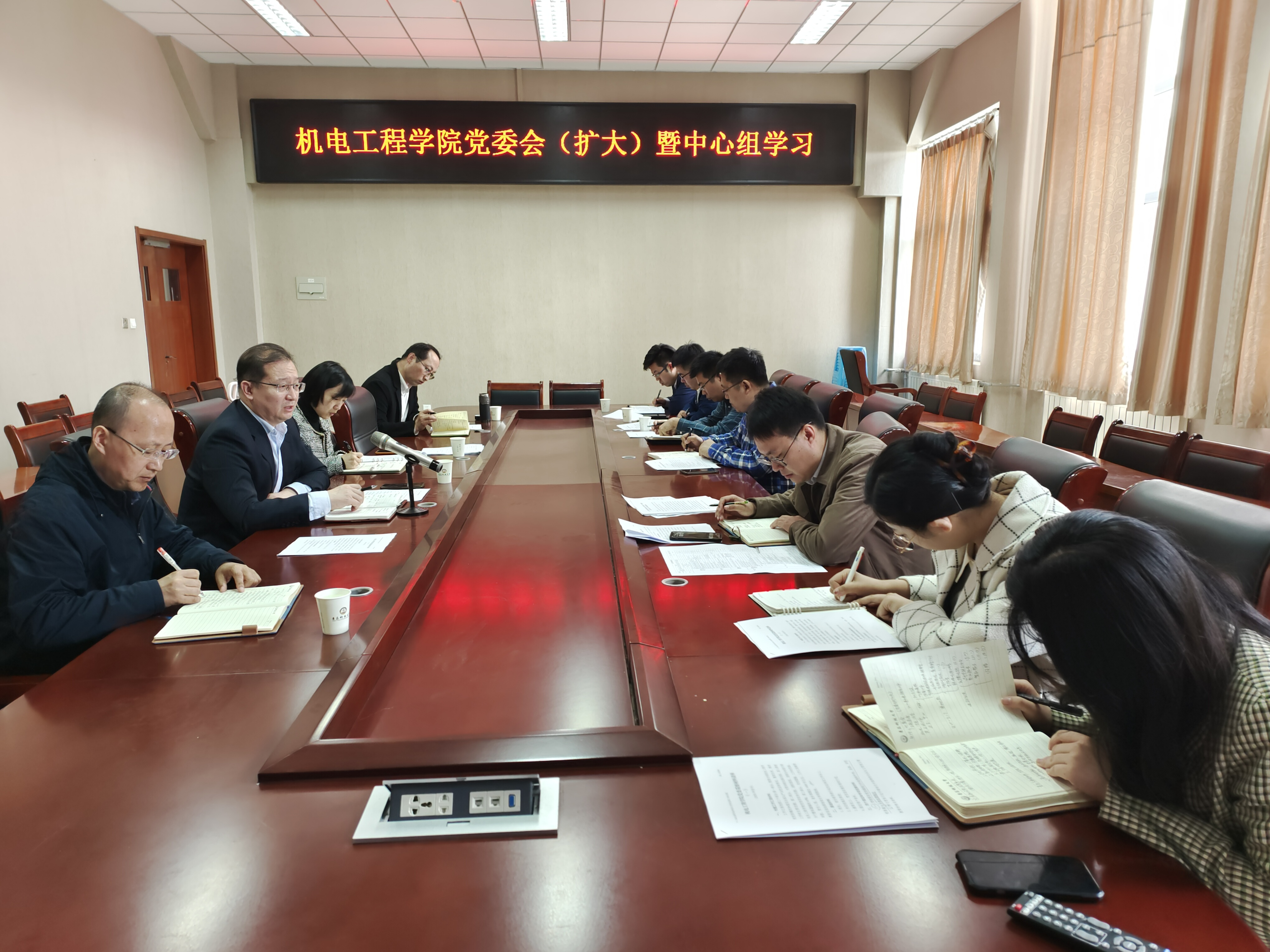 4月14日上午,pg娱乐电子游戏党委在机电楼518会议室召开学院党委理论学习中心组(扩大)学习会传达学习贯彻习近平新时代中国特色社会主义思想主题教育动员部署会精神。学院党委理论学习中心组成员、党支部书记及部分专职辅导员参加会议,会议由学院党委书记任允晓主持。