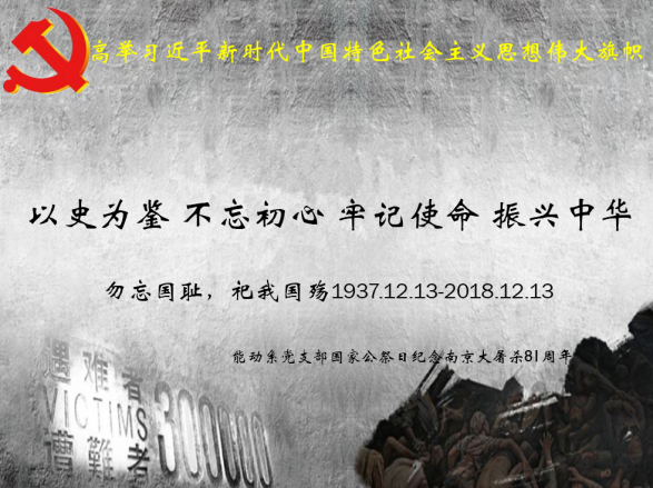 12月13日,能动系党支部在pg娱乐电子游戏518会议室召开支部全体党员大会,开展“以史为鉴,不忘初心,牢记使命,振兴中华”主题党日活动,缅怀南京大屠杀的无辜死难者,缅怀所有惨遭日本侵略者杀戮的死难同胞,缅怀为中国人民抗日战争胜利献出生命的革命先烈和民族英雄。