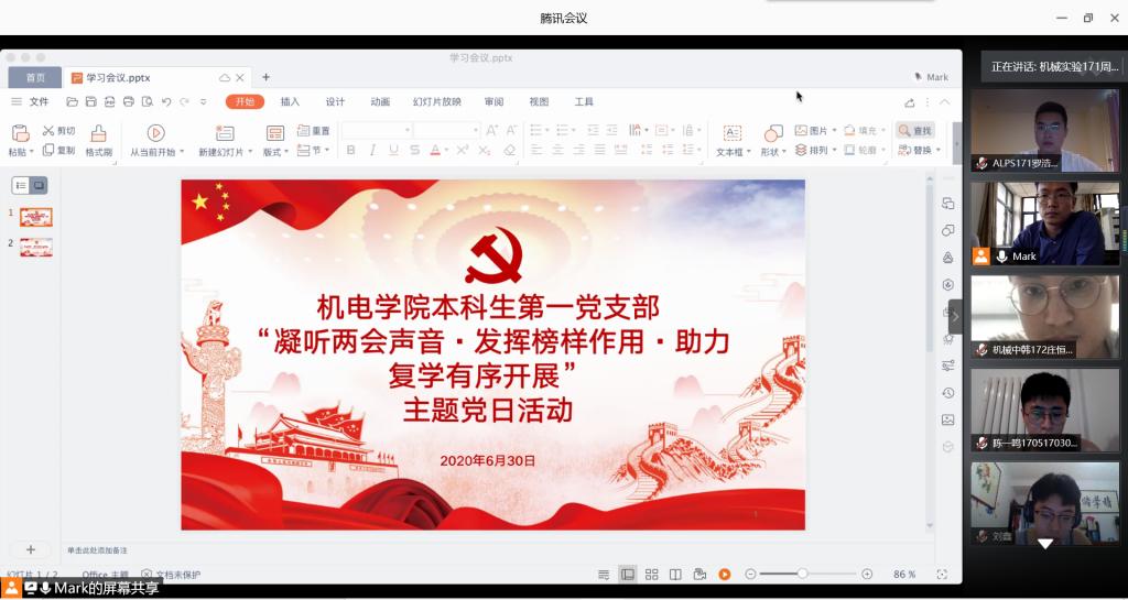 为更好地学习贯彻两会精神,弘扬战 “疫”精神,引导广大党员坚定理想信念、恪守党的宗旨,发挥党员的先锋模范作用。6月30日下午,pg娱乐电子游戏本科生第一党支部召开“凝听两会声音·发挥榜样作用·助力复学有序开展”主题党日活动。本科生第一党支部全体党员参会,会议由党支部王玉凯老师主持。