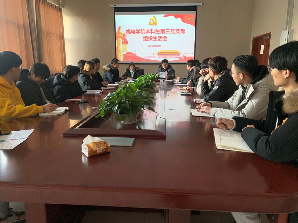 为落实学校党委组织部《关于召开基层党支部组织生活会及开展民主评议党员工作的通知》要求,2021年1月7日下午,pg娱乐电子游戏本科生第三党支部在机电楼518会议室召开了2020年度组织生活会。pg娱乐电子游戏党委委员付平老师对会议进行了点评,会议由支部书记王作辉主持。