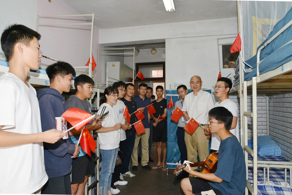 陈克正一行来到学生公寓与学生进行了亲切交谈,并向他们送去节日祝福。在崂山校区北苑8号楼学生宿舍和“图灵学舍”,陈克正与学生座谈交流,详细询问秋季开学以来学生在校学习、生活情况,询问大家国庆假期打算、面临哪些困难,并嘱咐大家在校期间积极参加学科竞赛训练,加强体育锻炼,利用国庆假期走下网络、走出宿舍、走向操场,动起来、燃起来、活起来!在崂山校区南苑5号宿舍楼,陈克正与同学们同唱《我和我的祖国》《蓝莲花》,与国旗合个影,加强学生爱党、爱国教育,共同为祖国母亲庆生。他勉励同学们结合建党100周年,加强党史学习教育,品读红色文化,传承红色精神,强化专业能力与综合素质,争做德智体美劳全面发展的时代新人。