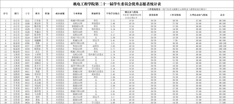 会议首先对上学期工作突出的学生会志愿者进行表彰。根据例会参会情况、团委值班情况、工作量整体情况、大型活动参与情况等指标,自行上报,部门负责人审查出候选名单,最终由主席团成员以及指导老师审批,确定评选出30名优秀志愿者(名单如下)。