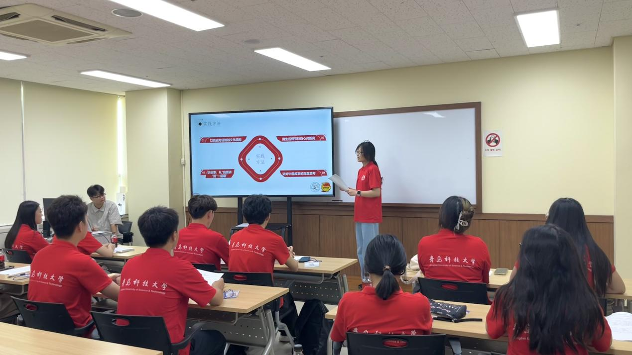 交流期间,实践团成员参与了韩语体验课,并进行了“文明互鉴青年行,青春共绘同心圆”主题宣讲。厉云哲同学首先从理论角度,系统阐释了讲好中国故事的深厚“底气源”——植根于中华民族多元一体格局的历史长卷、滋养于“和而不同”文化基因的精神共鸣、彰显于新时代各族人民共同团结奋斗的现实图景。而后,崔圣玮同学则立足青年实践,生动分享了在韩讲好中国故事的智慧:以真诚对话跨越文化隔阂,用生活细节传递人文温度,将单向“我要讲”升华为共创“一起聊”的双向对话。她强调,青年应以平等姿态和鲜活叙事,担当中华文明与世界沟通的桥梁,推动文明在真诚互鉴中共生共荣。两位同学的宣讲,充分彰显出理论基石与青年实践的交相辉映,深刻诠释了新时代青年在促进文明交流、铸牢中华民族共同体意识中的使命与担当,赢得了在场师生的高度认同。