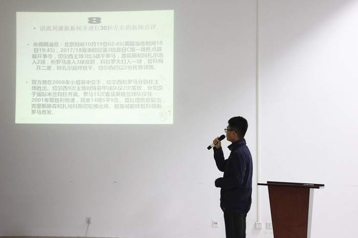 本次比赛包括自我介绍及才艺展示、现场选答和评委点评三个环节。在主持人刘宝忠精彩的开场白下,比赛正式拉开序幕,选手们闪亮登场,他们用自己独特的方式进行自我介绍,各个多才多艺,发挥特长向评委们展现自信的自己。接着,由选手在非凡逻辑、口才考验、情景设置和即兴播报四个类型中根据特长及意愿自行选择并应答,选手们灵活多变,良好的语言表达基础和临场应变能力充分展示出了他们扎实的主持功底。最后,由广播站优秀播音员田依林对选手的表现做了综合评价,充分肯定了部分选手良好的语言表达能力和临场应变能力,表达了对选手们决赛表现的期待并对此次活动的主办方表示了感谢。至此,pg娱乐电子游戏第四届主持人大赛初赛在观众们热烈的掌声中圆满落下帷幕。