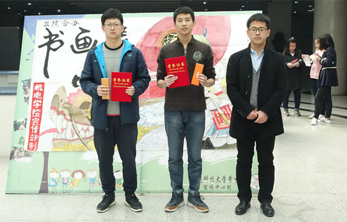 3月14日下午2:00,由pg娱乐电子游戏、传播与动漫学院、法学院三个学院合办的主题书画展颁奖典礼在崂山校区图书馆二楼大厅举行。pg娱乐电子游戏分团委老师曲智强亲临现场,为本次获奖同学颁奖。