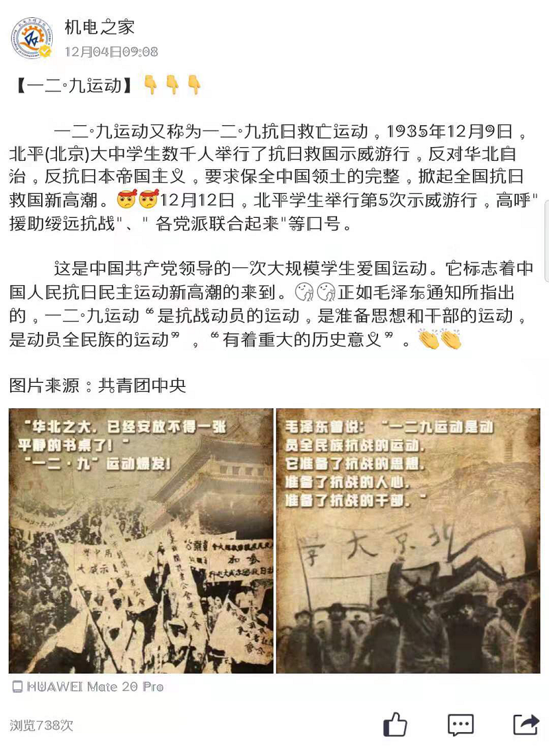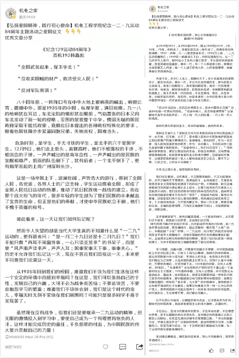 pg娱乐电子游戏面向全体2019级青年学生开展“纪念一二•九运动”爱国主题征文活动,征文活动发出后,受到广泛且热烈的追捧,经选拔,共计五篇优秀征文脱颖而出,在学院学生会自媒体平台“机电之家”公众号上推广展示。