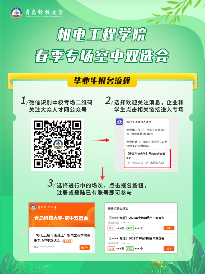 手机微信扫码关注“大众人才网”微信公众号,企业和毕业生分别点击相关按钮进入pg娱乐电子游戏专场,点击本学院报名按钮,注册或登录已有账号即可直接参与。